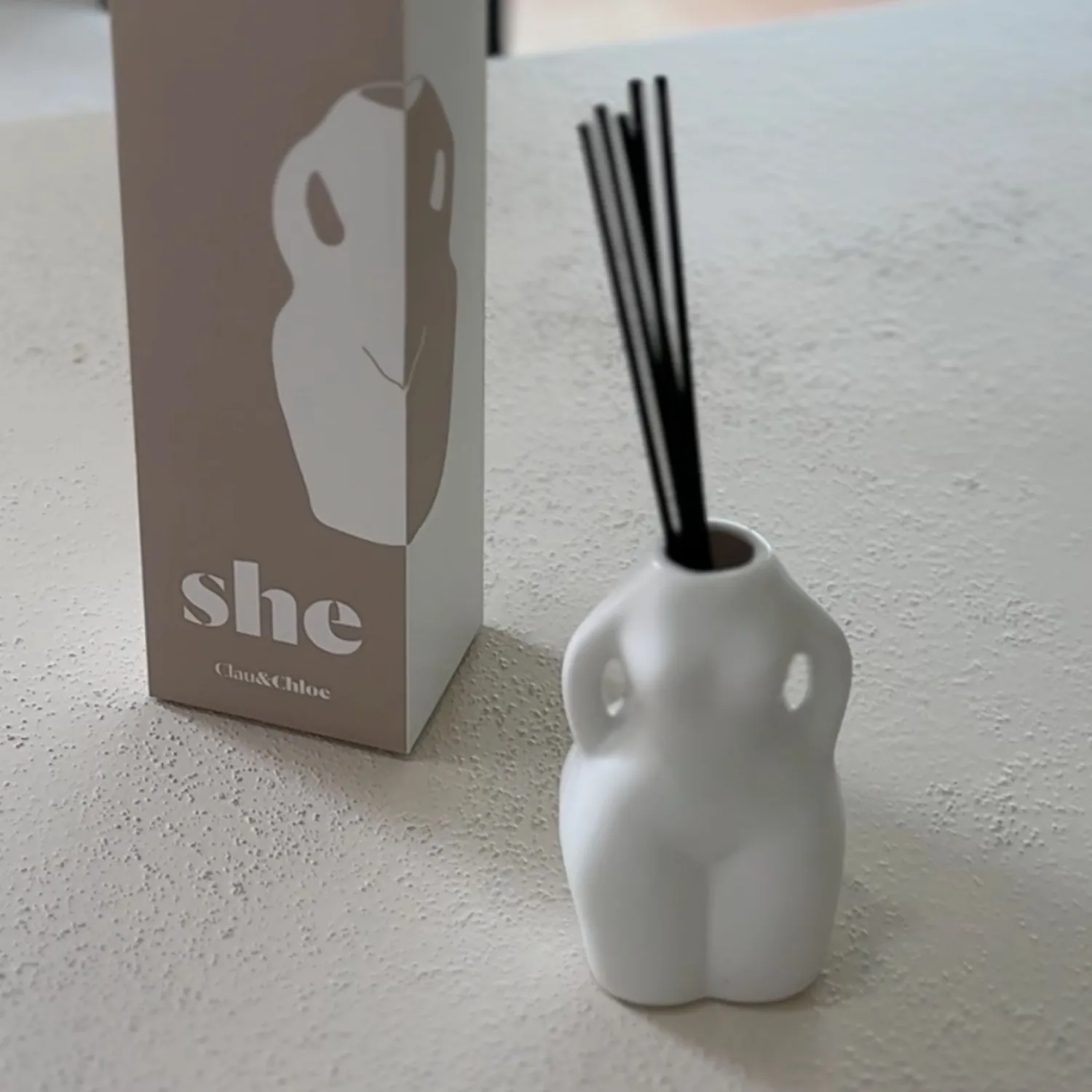 El ambientador en mikado She de Clau&Chloe presenta un diseño elegante con una botella en forma de silueta femenina, ideal para decorar cualquier espacio.