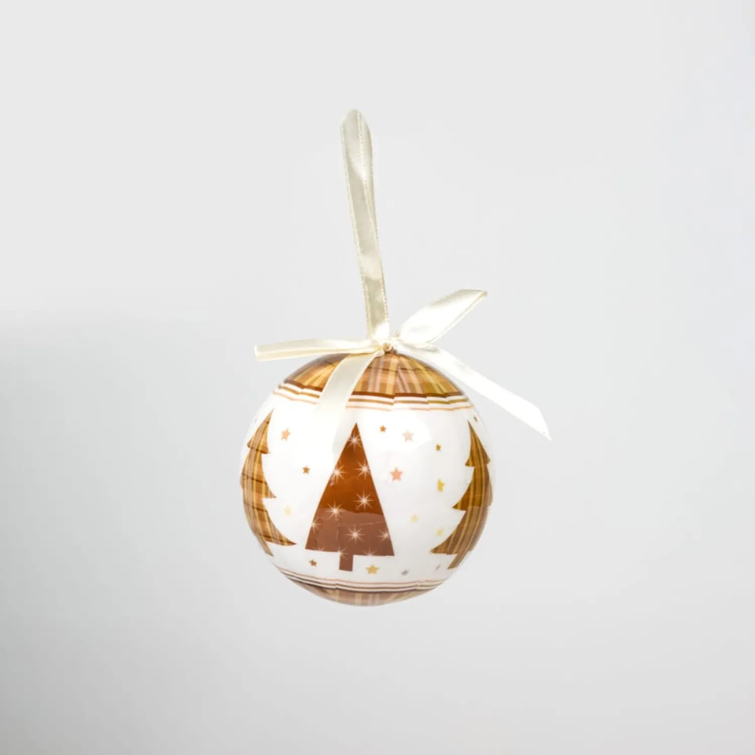 Este set de bolas para el árbol cuenta con 6 unidades de color blanco con arbolitos de Navidad. Todas ellas vienen decoradas con un lazo dorado y tienen unas dimensiones de 8 cm.