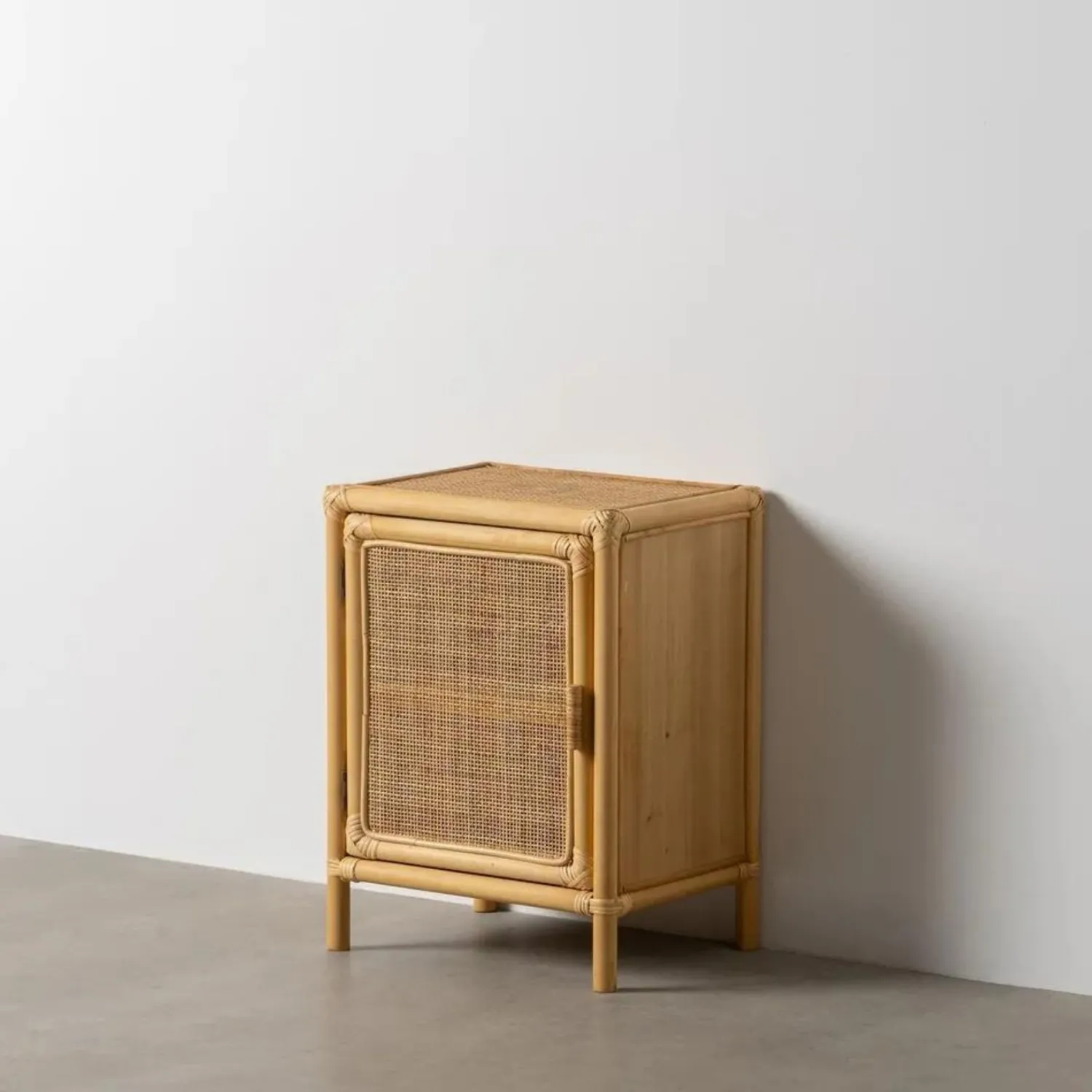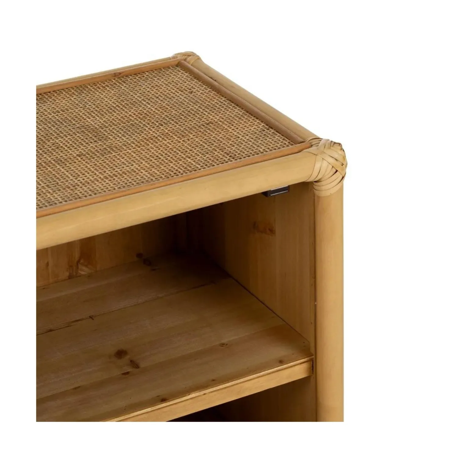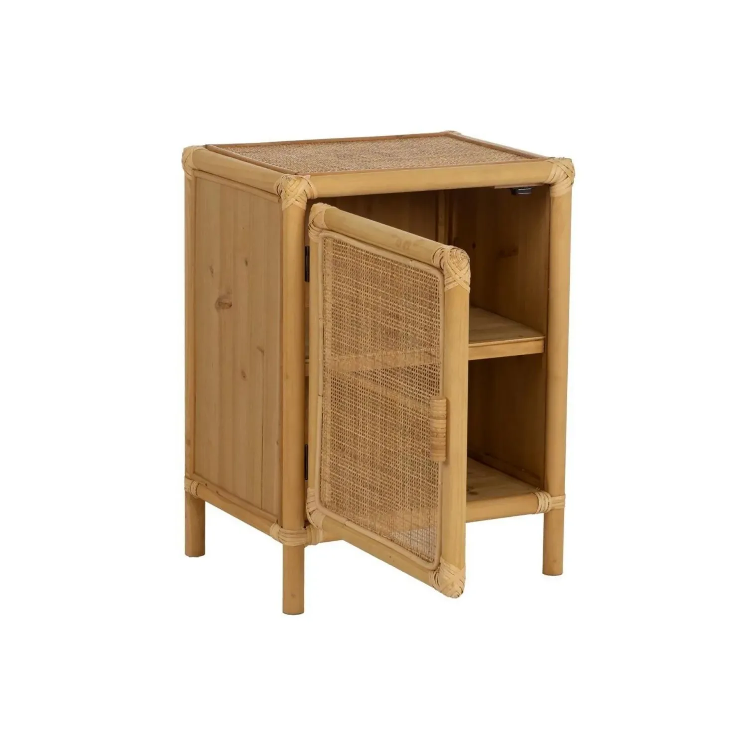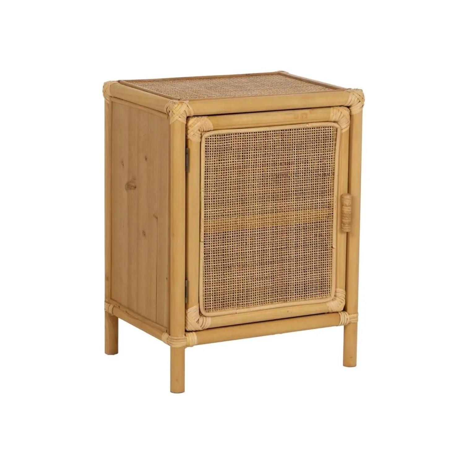 Con unas dimensiones de 46x35x60 cm, ofrece un amplio espacio de almacenamiento y un encanto rústico que añade calidez y carácter a cualquier dormitorio.