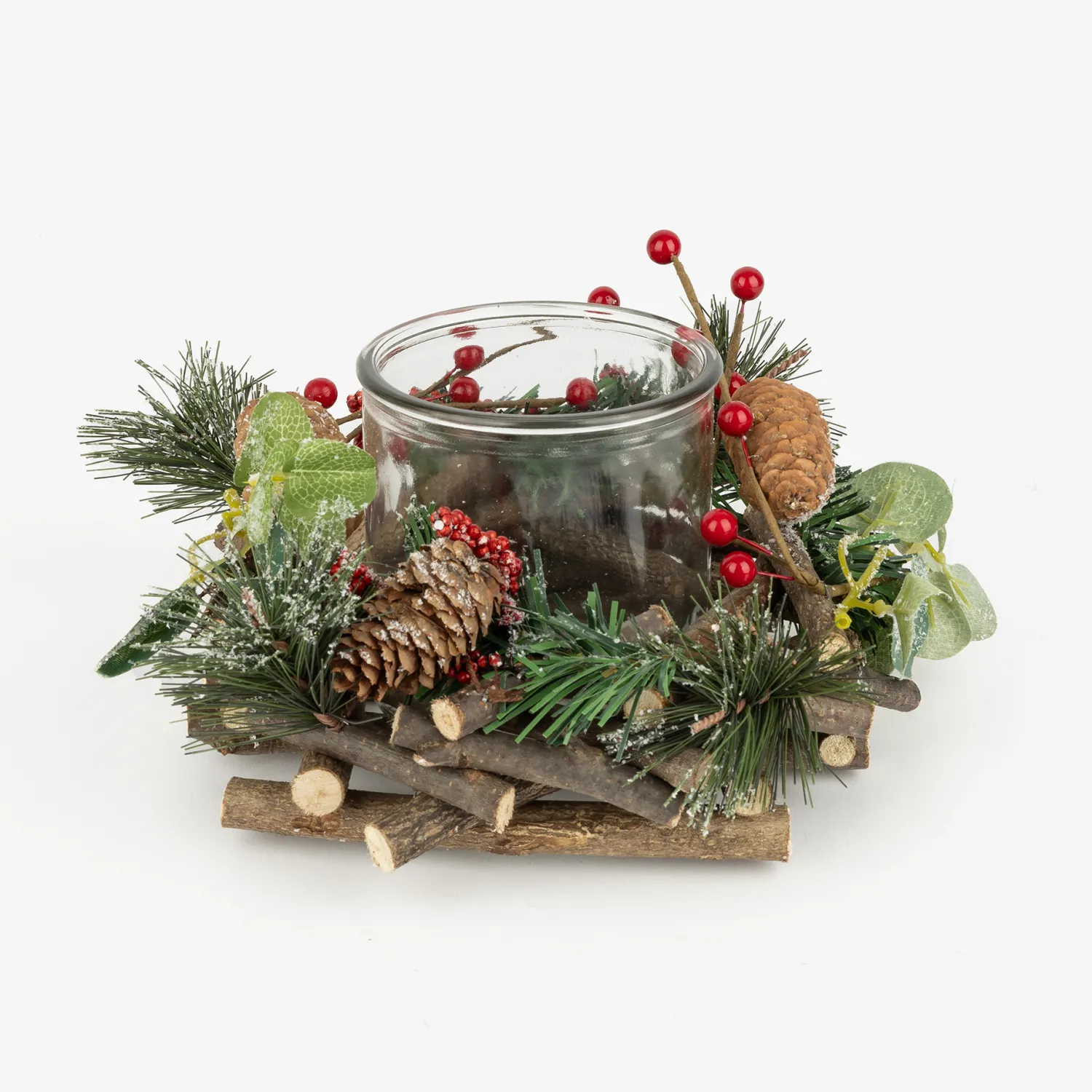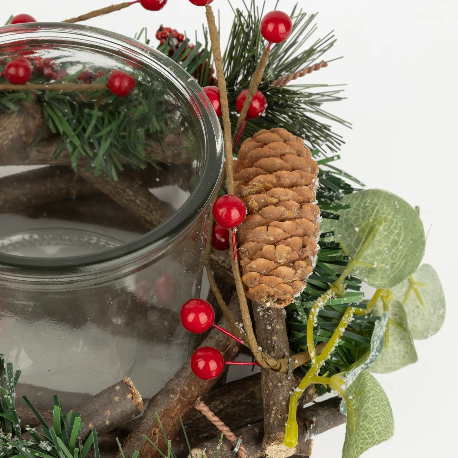 Añade un toque natural y festivo a tu decoración navideña con este portavelas adornado con bayas y piñas.