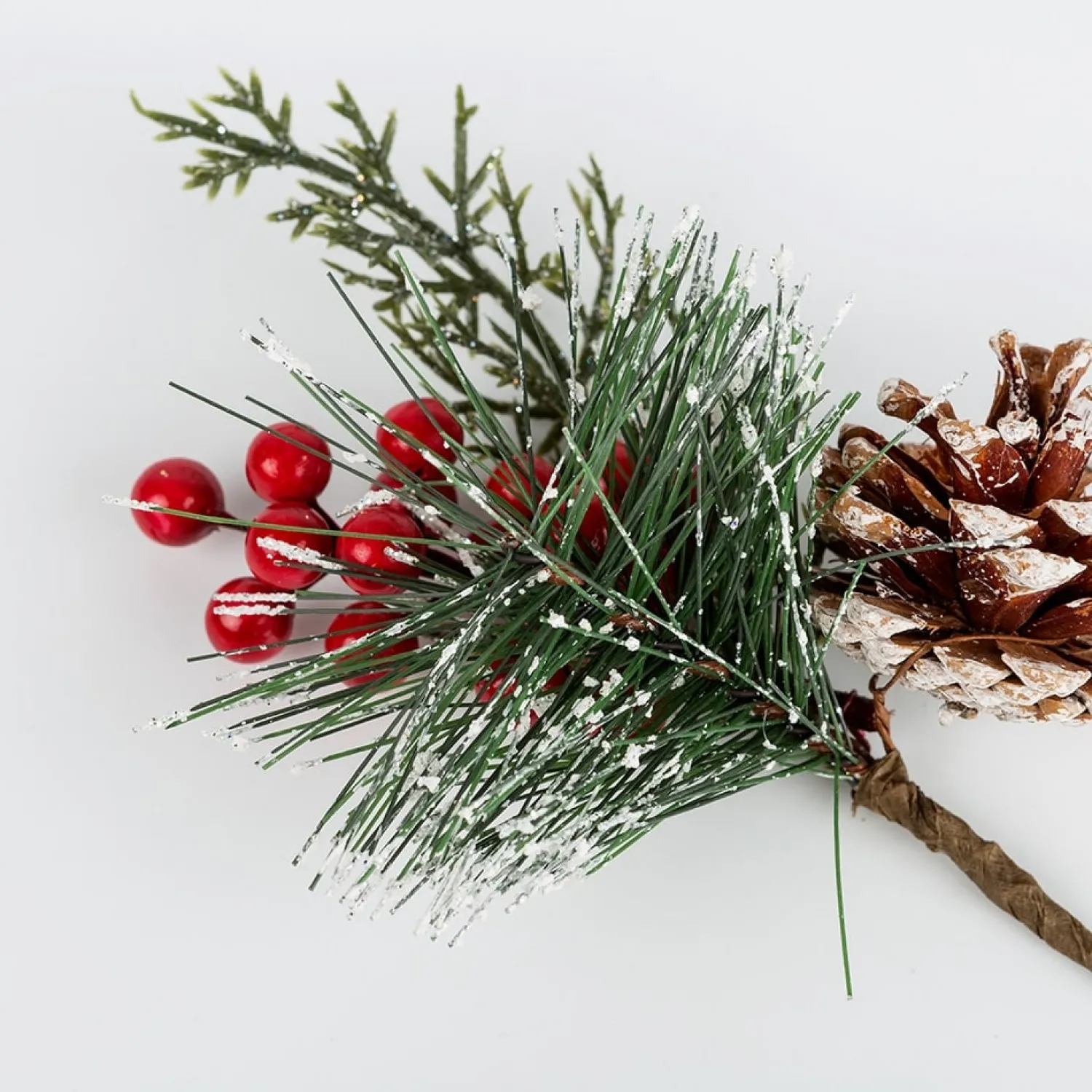 - Diseño festivo: La combinación de piñas, frutos rojos y ramas de pino cubiertas de nieve artificial evocan la magia del invierno y la Navidad.